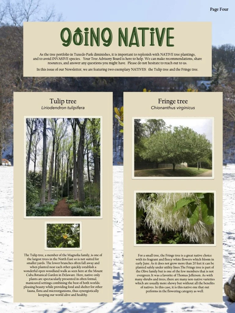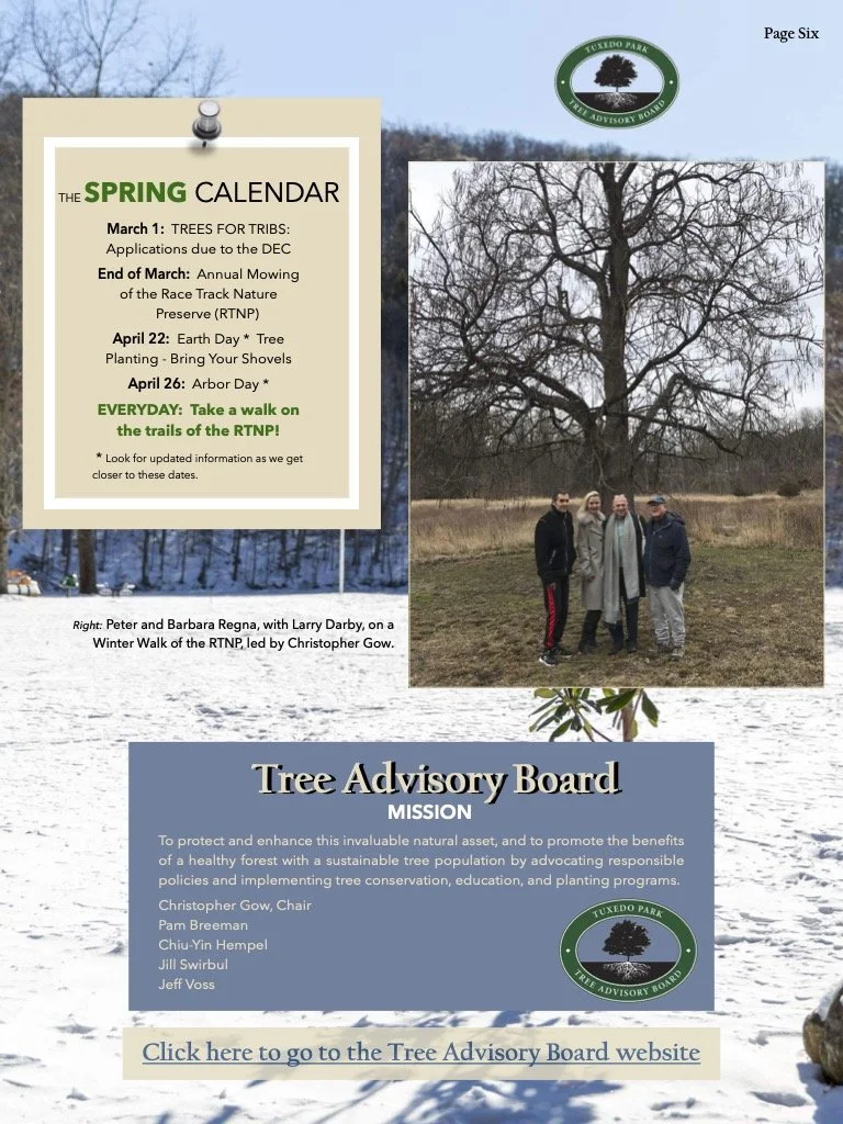 To continue the momentum of suppressing invasives and encouraging native plants. No experience is necessary as training will be provided. All that is required is a willingness to help benefit the community of Tuxedo Park as well as the environment. Please contact tptreeboard@gmail.com or speak to any of the Tree Advisory Board members, Chiu Yin Hempel, Christopher Gow, Jill Swirbul, Father Rick Datos-Robyn and Alan McHugh (Trustee Liaison).